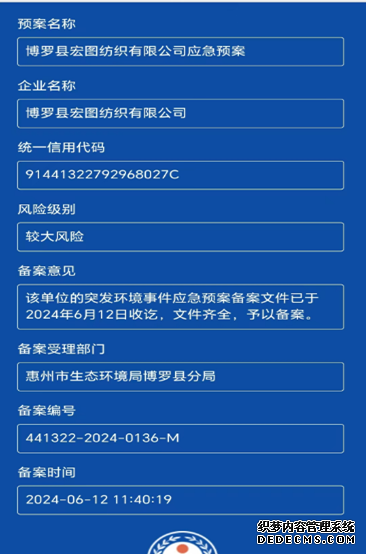 已制訂《博羅縣宏圖紡織有限公司環(huán)境風險評估報告》,并于2017年10月25日上報博羅縣環(huán)境保護局備案; 2021年和2024年在惠州市生態(tài)環(huán)境局博羅分局進行再次備案 |