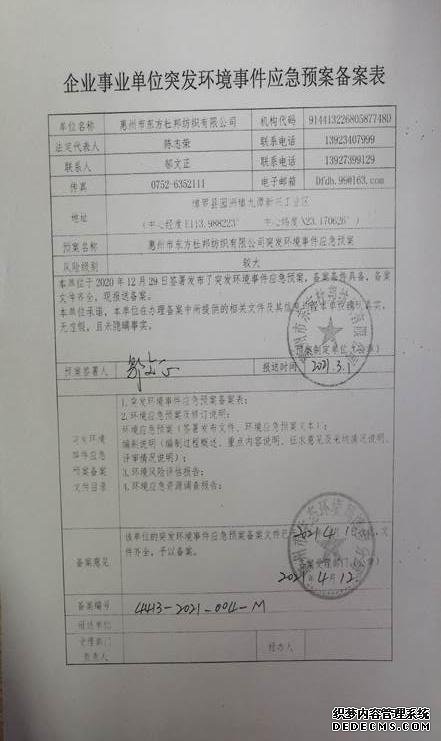 已制訂《惠州市東方杜邦紡織有限公司突發(fā)環(huán)境事件應(yīng)急預(yù)案》,并于2021年 4月12日在博羅縣環(huán)境保護(hù)局備案,備案編號(hào):4413-2021-004-M |